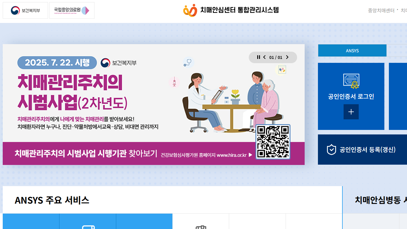 치매안심통합관리시스템(ANSYS, Alzheimer's Disease National management SYstem)은 보건복지부 산하 중앙치매센터가 구축·운영하는 전국 단위의 치매 관리 통합 플랫폼입니다. 전국 256개 치매안심센터와 중앙기관이 하나의 시스템 안에서 치매 환자 정보를 공유하고, 서비스 이력을 관리하며 정책 수립에 필요한 데이터를 축적합니다.