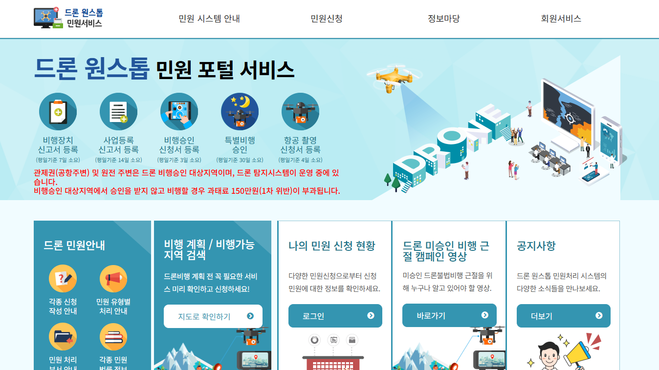 - 비행승인 필요 지역: 원스톱 서비스에서 승인 신청 필수