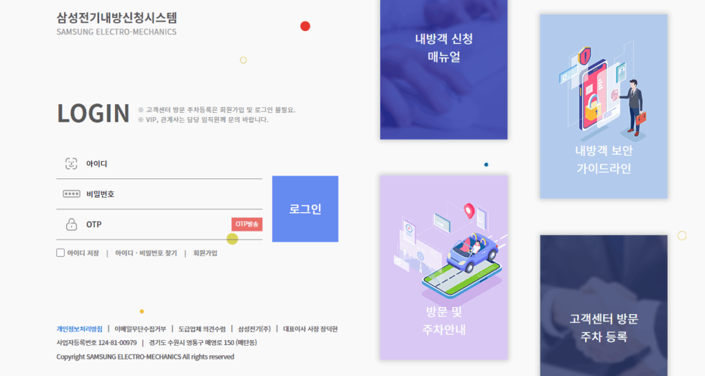 삼성전기와 계약 관계에 있는 협력사나 외주업체는 '협력사 포털 시스템' 을 통해 별도로 내방신청을 진행할 수 있습니다.