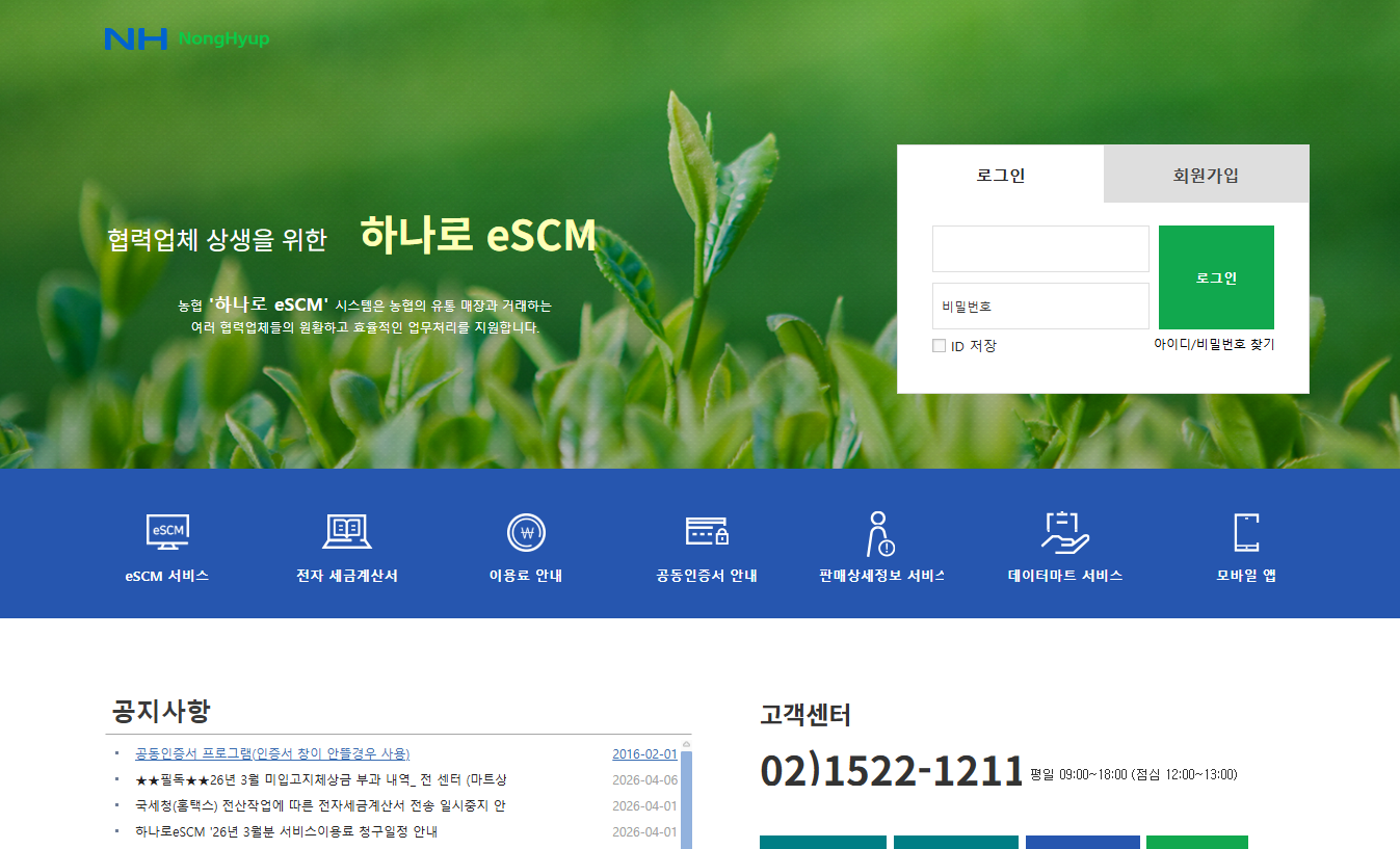 하나로 eSCM은 협력업체로 등록된 사업자만 사용할 수 있는 B2B 전용 시스템입니다. 최초 이용 시에는 농협 담당 MD 또는 해당 하나로마트 바이어를 통해 협력업체 등록 절차를 먼저 완료해야 합니다.